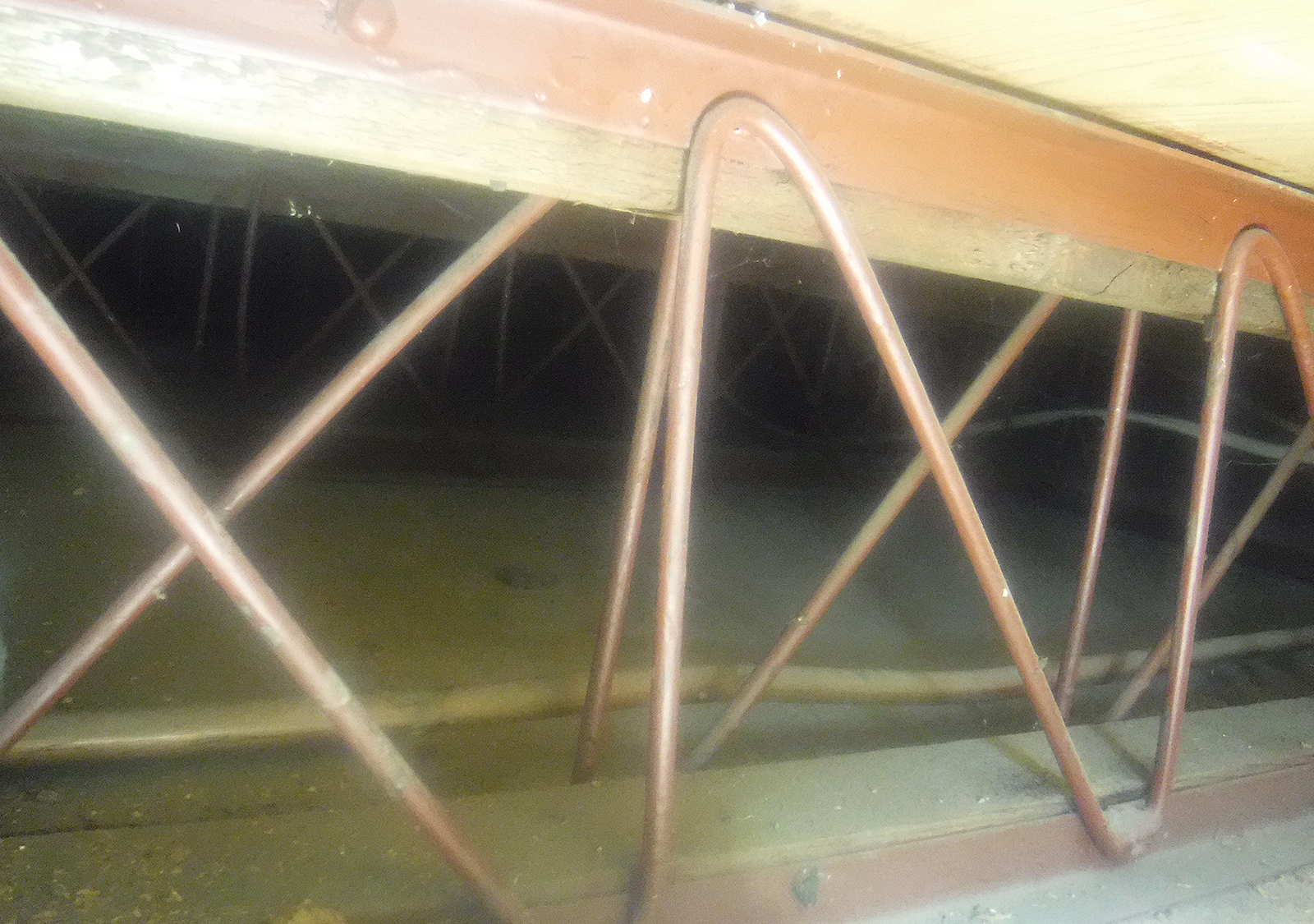 A section of purlin has been removed from the truss roof to accommodate the installation of a rooflight (Velux-style), and no additional strengthening was noted to the top or bottom chords of the truss to compensate for the loss of support. This has locally weakened the roof structure and may reduce its ability to evenly distribute loads across the rafters.